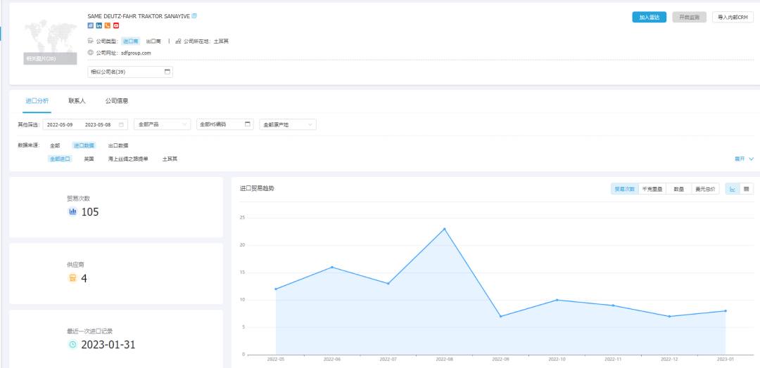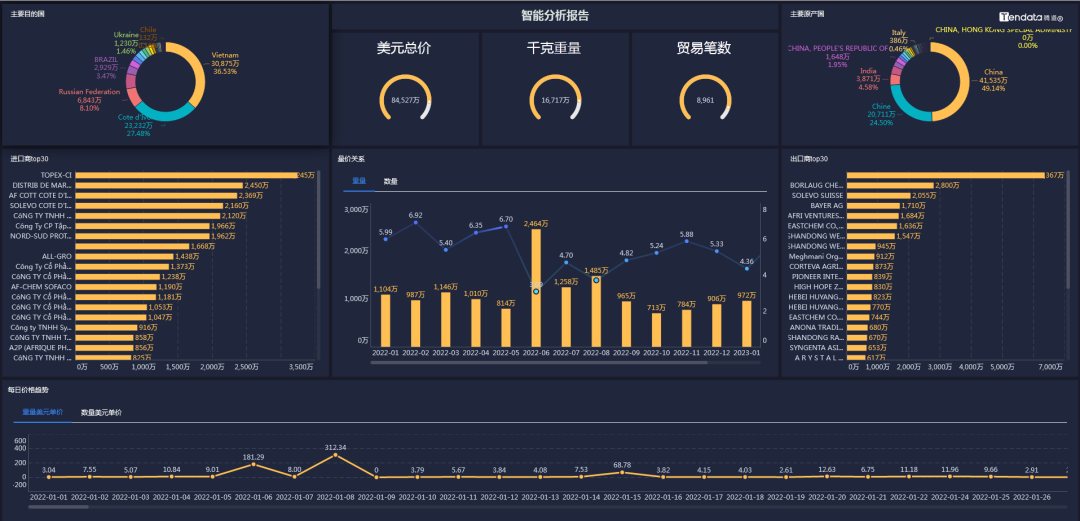bbin宝盈集团官网外贸通能够一键查询和追踪某类产品的全球交易详情,并体现整个供应链的采购供应,最大程度展示整个贸易网的情况,基于交易数据的统计分析,多维度分析行业、产品市场趋势,助力企业洞察市场变化、把握不同市场采购淡旺季,从而准确定位目标市场。