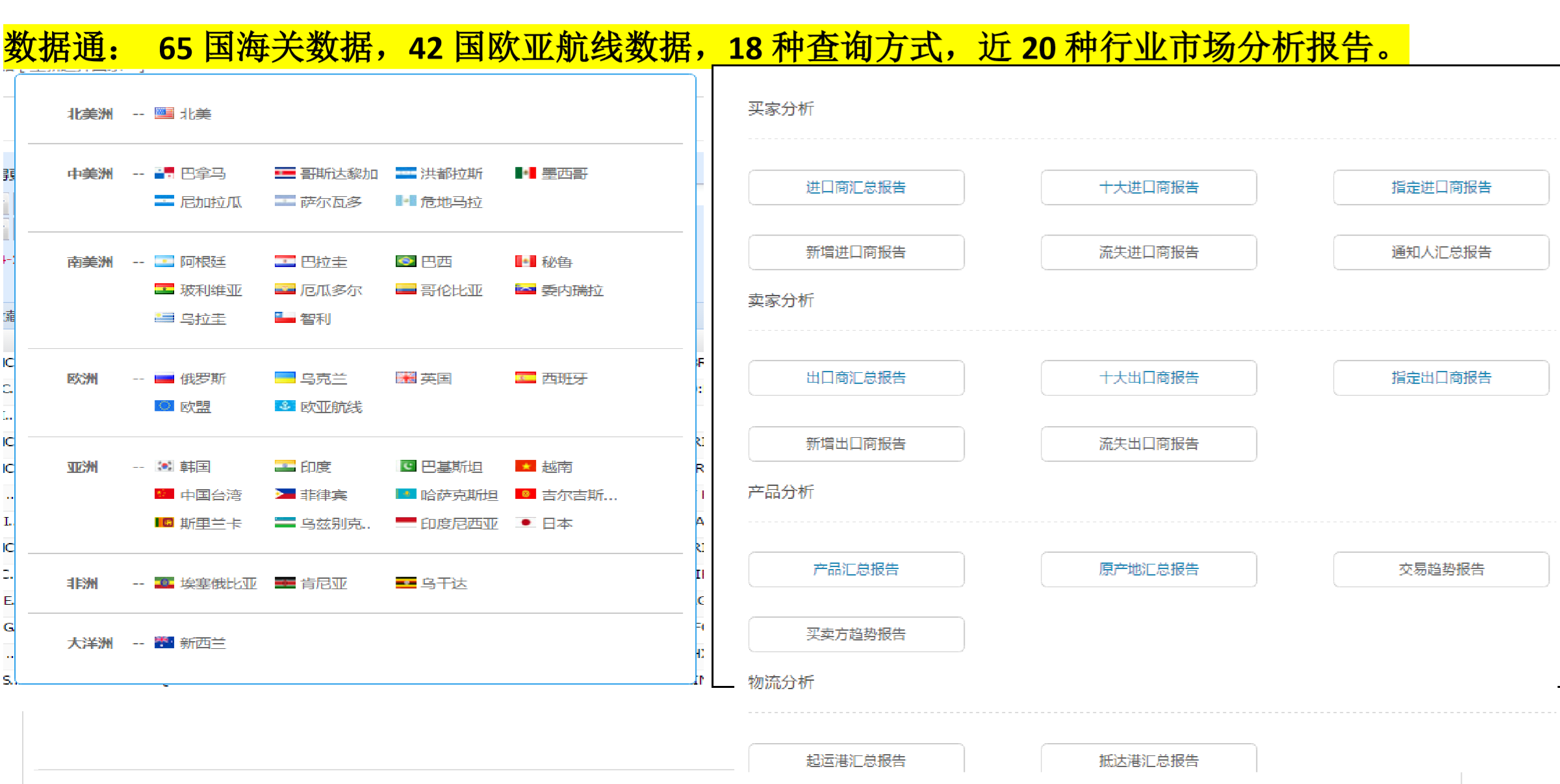 bbin宝盈集团官网海关数据库,实时给予全球涵盖65国海关数据,42国欧亚航线数据,100+亿实时贸易数据,定位1.8亿全球企业信息,帮助您分析全球市场贸易趋势及分布,为您的产品快速、精准、科学地锁定热销国家和新兴市场。